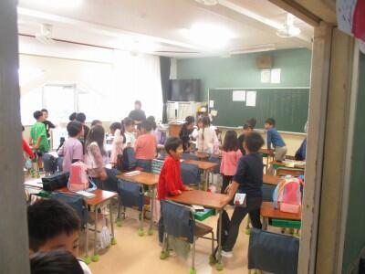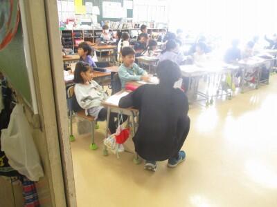 1年1組「みんなのにこにこ大さくせん」です。とんぼルームがいっぱいになるほど、多くの参観者がありました。