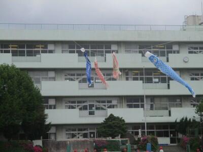 こいのぼりが泳いでいます!が、今日は曇り空、その後に雨でした。3年生の遠足は延期になり・・・でも、みんなで体育館でお弁当を食べました。次は晴れるといいなー。